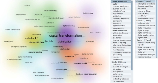 The second stage aimed to define the search’s final keywords. For this definition, a cluster analysis was performed (Figure 2) around the three central terms – “digital transformation”, “internet of things”, and “artificial intelligence”. From this analysis, the terms “industry 4.0”, “digital technology”, “operations management”, “digitalization”, and similar terms were chosen as keywords for extracting the databases by their relevance.
