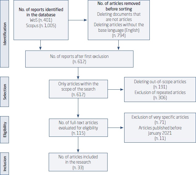 The bases used for this research were Institute for Scientific Information (ISI) WoS and Scopus, because they are widely covered and validated by the academic community (Chadegani et al., 2013). There are other possible sources of databases, such as the Google Scholar database. However, in the comparative study developed by Harzing and Alakangas (2016), some restrictions related to this database are presented, being the most relevant the lack of the publications’ quality control, which leads to include some non-academic publications, such as blogs or articles from secular journals in search results. Other limitations mentioned are operational, such as duplication of records or the difficulty in performing filters, which, in the case of WoS and Scopus, is easy to solve, reasons that justify the use only of WoS and Scopus bases.