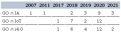 Of the total of 33 studies analyzed, 100% refer to some topic related to OM. Among them, 93% (25 studies) mention i4.0, 81% (22 studies) mention IoT, and 70% (19 studies) relate OM to AI. Table 2 shows the distribution of the intersections between OM and each of the themes over the years.