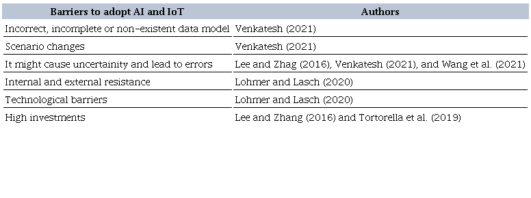 According to Ross et al. (2019b), there are challenges related to the adoption of technological tools. According to the authors, many companies report that they find it difficult to effectively adopt these new tools. Westerman et al. (2019) state that understanding and adopting new technologies while seeking to understand which aspects of the company’s culture and processes should be kept or modified is another challenge faced by organizations. Table 3 presents the synthesis of the barriers encountered to adopting AI and IoT.