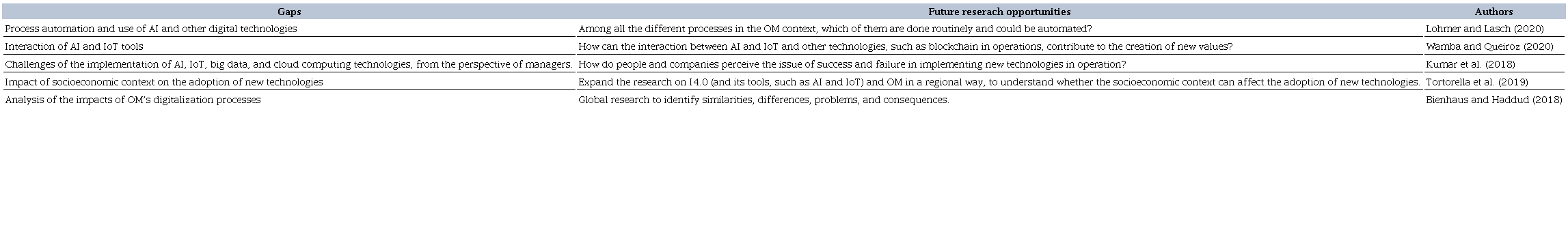 In response to Q2, concerning improvements made because of the use of new technologies, there is a group of studies that focus on operational improvements, such as automation of processes and procedures; ways to increase productivity; achieve improvements in the decision-making process; improvements related to the control and monitoring of information and operations; reduction of general costs; and improvements in employee satisfaction. As a consolidation of these analyses, this paper presents a summary table (Table 5) with some questions that arise from gaps that remain when analyzing the impact of both barriers and benefits of adopting AI and IoT in OM.
