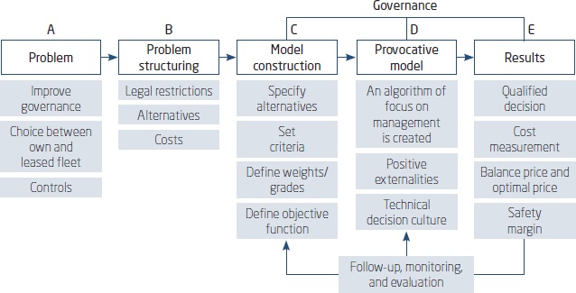 Adapting the flowchart proposed by Belton and Stewart (2002), Figure 1 shows the methodological sequence of the decision-making process. With the problem in A, the current governance stage is shown, in which the own fleet is questioned in relation to the leased one and the respective management controls. In B, the problem is structured by observing legal restrictions, costs, and alternatives. In the model’s construction in C, the objective function is specified with its parameters and criteria. In D, an algorithm is created, a standardized solution path for the decision. As results (E), a qualified decision is expected, costs are measured, and the optimal and equilibrium prices for possible rental contracts are verified.