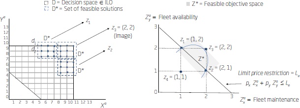 In Figure 3, the objectives space is plotted with the functions that aim to maximize the fleet management model, given the possibility of the decision on relevant management aspects, defined a priori . The objective functions (1) and (2) map the feasible points in the decision space. The cost parameter is the cost of own fleet, so the change to leased fleet has the restriction equivalent to the costs of remaining with the own fleet of vehicles. cles. The function Zª maps the decision space in search of its images, given its constraints, creating Z* as the feasible objectives space.