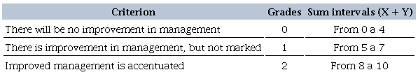 There are two criteria that represent the decision-makers’ preferences, given in the objective functions and restrictions: 1. according to the sum of the weights assigned to the attributes, there will be a scale of scores that will show the degree of improvement in management expected with that alternative; and 2. the sum of the decision variables should be at least 3, which means imposing that no alternative with a score of zero in the decision variables will be accepted, corresponding to a minimum degree of acceptable management quality.