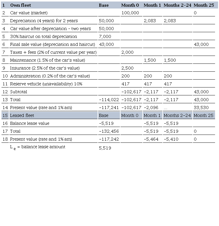 The L e shows the result of the cost-benefit analysis between own or leased fleets. For values of L T > L e > VP p, there will be no financial advantage in choosing the leased fleet. For values of L T < L e < VP p, it is financially advantageous to choose the leased fleet.
