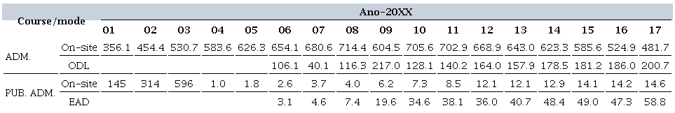 From Inep’s Statistical Synopsis, we can look through the historical series from 2001 to 2017 regarding the Administration courses, where we see the enrollments, entrants2, and graduates. The two main areas were Administration and Public Administration, in the modalities on-site and open and distance learning (ODL). Table 1 summarizes the enrollments for both courses and modes.
