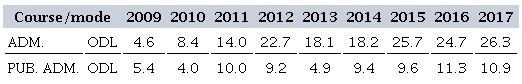 Table 2 presents an overview of ODL Administration and Public Administration courses in the historical series from 2009 to 2017. We observe that the Administration course grew exponentially between 2009 and 2012, going from 4,646 to 22,743 graduates. Despite a decline in 2013, from 2015 onward, there was an increase (7,667 more graduates compared to 2013), with a small variation until 2017. As for the Public Administration course, the 2010-2011 period shows an increase in the number of graduates (from 4,010 to 10,092). Even with a drop in 2013, there were few changes in the number of graduates in ODL.