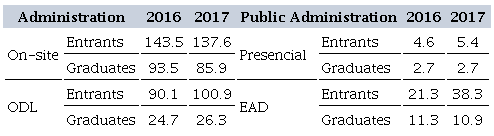 Regarding entrants and graduates in the Administration course, in 2016 and 2017, in both on-site and ODL modes, the total number of entrants is higher than the number of graduates. The analysis of the Public Administration course shows the same situation. In this case, enrollments in the ODL modality stand out, as shown in Table 3.
