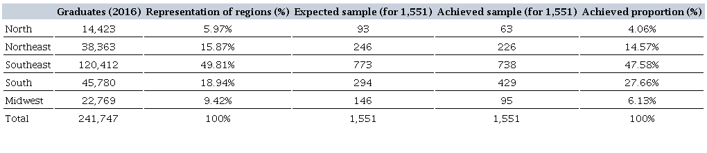 The 2016 Statistical Synopsis3 served as a parameter for regions’ stratification. Based on this synopsis, we prepared Table 4, which shows the representation (in percentage) of the country regions in relation to the total number of graduates in 2016; and the proportion of each region in the study. We sought to find out each region’s representation in relation to the total number of graduates in order to draw the sample, which, despite being non-probabilistic, indicates how far away it was from the ideal.