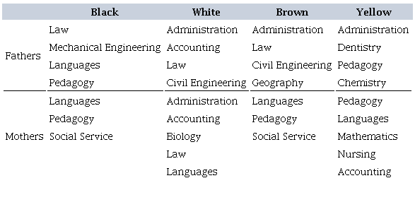The high frequency of responses that showed identification with the course led the authors to examine if there was a relationship with the education of their parents; we noticed that 8.3% of fathers and 4.3% of mothers had an Administration degree. At the undergraduate level, only 15.2% of men completed a course, according to this regional distribution: South 19.3%, North 12.5%, Northeast 11%, Midwest 12.5%, and Southeast 15. 1%. Regarding mothers, only 16.5% had a higher education degree, dispersed among the regions: South 18.9%, North 10%, Northeast 13.5%, Midwest 14.3%, and Southeast 17, 4%. Table 5 summarizes the outstanding data regarding the higher education degree of graduates’ fathers and mothers by color/race.
