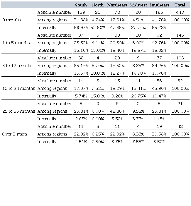 In general, graduates were without a job after completing the course for one to 24 months, which represents 26.8% of the sample, especially in the South, Northeast, Midwest, and Southeast regions. However, 12.8% of the respondents, mainly from the South, Northeast, and Southeast, said they remained out of work for six to 12 months after completing the course. On the other hand, in the North region, 52.5% of the graduates got a job just after graduation. Data show the high level of employability in this field since, in all regions, the percentage of graduates who achieved professional insertion in the first year after completing college was above 73%.