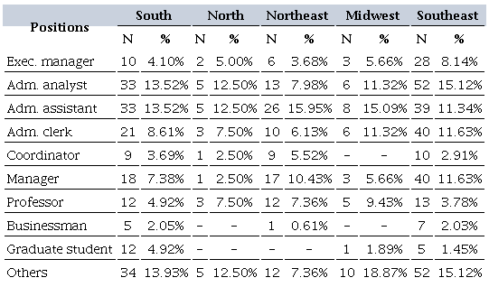 The most mentioned positions were executive manager, administrative analyst, administrative assistant, administrative clerk, coordinator, manager, and professor, as shown in Table 7.
