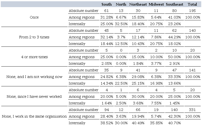 Regarding job changes after graduation, Table 8 provides an overview of the collected data, highlighting 39.1% of respondents that remain in the same organization. In addition, 23% said they had changed jobs at least once, especially graduates from the South and Southeast. In addition, we see a balance between the group that is not working (16.6%) and the group that changed jobs two or three times (16.5%). In the first group, South, Northeast, and Southeast regions prevail, while in the second group, only graduates from the South and Southeast are more frequent.