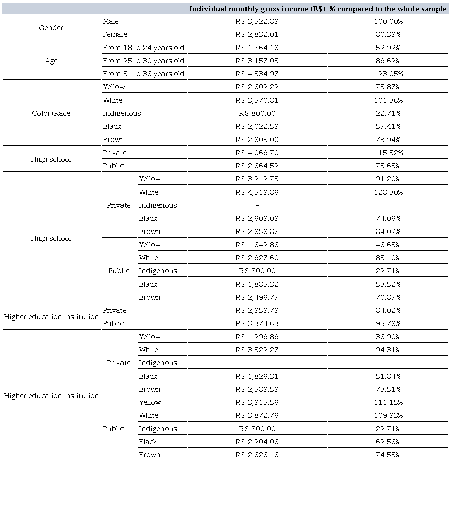 Proceeding with the analysis, Table 9 summarizes the gross monthly income of graduates by gender, age, color/race/ethnicity, and by HEI. With salary as a reference, when analyzed by gender, we observe that women’s average monthly income is R$ 2,832.01, and men’s is R$ 3,552.89, a difference of around 19%. By age group, graduates between 18 and 24 years old receive, on average, R$ 1,864.16, an income relatively higher than that disclosed by the Brazilian Inter-Union Department of Statistics and Socioeco-nomic Studies (Departamento Intersindical de Estatística e Estudos Socio-econômicos – Dieese) (2018), of R$ 1,348,00 for people employed in Brazil in the age group up to 29 years old. Compared to Dieese’s data (2018), the average gross monthly income of R$ 3,157.05 of graduates aged between 25 and 30 is higher than in all age groups above 29 years old. Among the age groups, the highest family income is concentrated in graduates aged between 31 and 36, with a value of R$ 9,812.90.