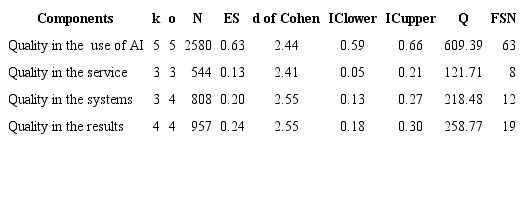 As noted, all components belonging to this construct have significance and homogeneity (p < 0.001). Cohen’s d values were considered very high (above 0.81), according to Cohen’s (1988) standard, indicating an excellent adherence to the construct. Yet, the effects produced by the components can be considered negligible (0.1 < r < 0.29) and large (r = 0.63) when observing the relationship between quality in AI use with satisfaction in services.