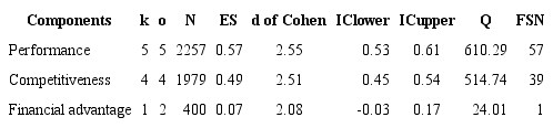 Design/methodology/approach: The study adopted the meta-analytic method, and its development followed three phases: 1. research; 2. collection; and 3. coding and data analysis. We analyzed 19 articles published in journals of international relevance from January 2000 to December 2020, present on the Web of Science and Science Direct platforms, totaling 128 observations and 28 topic-related.