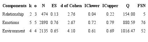 Concerning NCFs calculated for this construct, for the relationship, emotions, and environment relationships, 5, 76, and 52 studies with null effects are needed for the effect sizes obtained by these components to reach the non-significance level.