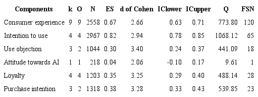 The six components found are significant both in their effect size (p < 0.001) and homogeneity (p < 0.001). The Cohen’s d indexes are satisfactory, with highlights to the components: use objection (3.40), loyalty (3.25), and purchase intention (3.28). As for the effect of the relationships between the response components and consumer satisfaction, only attitude toward AI showed a weak effect (r = 0.04), both in Pearson’s r and after its correction in Fischer’s Z.