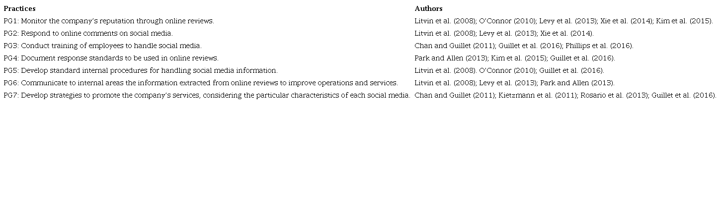 Thus, it is necessary to understand which attitudes and strategies are being implemented by managers on account of the use of social media (Xie et al., 2014; Kwok et al., 2017). In this sense, Table 1 presents a set of social media management practices proposed by Pereira and Freitas (2018) from a collection of approaches related to managerial procedures cited in the literature on the hospitality industry.