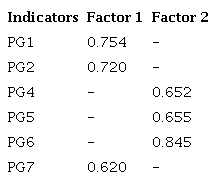 The scree plot presented the eigenvalues of each factor and allowed visualization that the model generated two factors with eigenvalues above 1. According to Hair Jr. et al. (2009), the scree test analysis indicates the number of factors that should be maintained in the model. Costa (2011) explains that factor loadings above 0.4 are considered significant. A varimax rotation matrix was applied, shown in Table 2, in which all the values of the scores of the loadings were above 0.62. When identifying the composition of the factors, variables PG1, PG2, and PG7 were classified in the first factor, and variables PG4, PG5, and PG6 fitted the second.