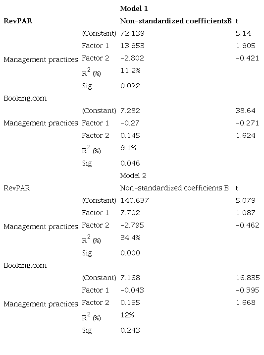 When analyzing the results of the F-ANOVA test, we observed a significant level of 0.022 and 0.046 for the RevPAR and Booking.com models, respectively. Therefore, as the sign was less than 0.05, the hypothesis that R2 is equal to zero was rejected. Therefore, it is possible to state that social media management practices influence RevPAR and Booking.com’s online review scores. Therefore, the models are significant.