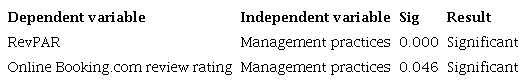 The first analysis used the performance indicator RevPAR as the dependent variable and social media management practices as the independent variables. It was found that the correlation coefficient (R) between the variables indicated a positive degree of association with R = 0.334. Next, the coefficient of determination (R2) was used to determine how much of the dependent variable was explained by the independent variable (Hair Jr. et al., 2009). R2 indicated that variations in management practices could explain 11.2% of RevPAR variations.