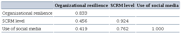 From the results found in Table 11, there is statistical evidence that supports hypotheses H2 and H3. Thus, it is possible to state that a greater use of social media tends to increase the SCRM level of an organization and that a greater level of use of SCRM via social media increases the organizational resilience of a company. Still, a greater use of social media does not tend to generate direct positive consequences on organizational resilience. Thus, the model suggests the existence of a mediating effect of the SCRM level variable, reinforcing the thesis of the importance of using managerial control techniques in the development of dynamic skills and their usefulness in helping to understand and use data from the media for strategic purposes (Bijmolt et al., 2010).