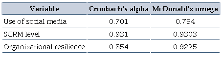 In order to validate the internal consistency of the collection instrument, Cronbach’s alpha and McDonald’s omega were calculated for each of the theoretical constructs used. For Cronbach’s alpha, values lower than 0.65 are unacceptable (Reidl-Martínez, 2013). Regarding McDonald’s omega, values above 0.70 indicate good reliability parameters (Béland et al., 2017). All results reached the minimum necessary value according to Table 2.