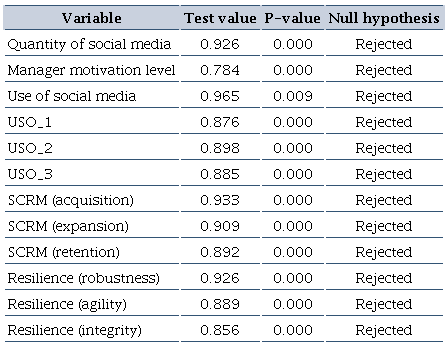 In order to identify the most appropriate test of means for the data set, the Shapiro-Wilk test was performed to determine whether the data set of the analyzed variables contained a distribution similar to the normal distribution. The test results are shown in Table 3.