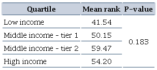 The horizontal axis labels in Figure 4 symbolize the degree of motivation, ranging from “1 = not at all motivated”, “5 = motivated”, and “10 – extremely motivated”, while the vertical bars represent the absolute frequency. It appears that the frequency of less motivated managers is found in the first two groups (“low income” and “middle income – tier 1”). Among the quartiles, the group “middle income – tier 2” had the highest average (8.87), followed by “high income” (8.60), “middle income – tier 1” (8.05); and “low income” (7.16). The results of the average test are shown in Table 4.