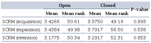 The SCRM level variable contains three dimensions: acquisition, retention, and expansion. Table 6 includes the average scores obtained in each dimension, separated according to the operational status of the business and the result of the average test.