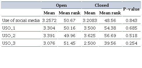 According to the data in Table 7, no coefficient of the Mann-Whitney test was less than 0.05. Therefore, it can be stated that, on average, there were no differences in the use of social media between the two groups. Considering the variable as a whole, it is observed that the average scores were between three (“3 = neither agree nor disagree”) and four (“4 = partially agree”), with more excellent proximity to the lower unit, indicating opportunities and possibilities to improve the use of social media for organizational purposes. Considering the item scores separately, it is noteworthy that the mean USO_3 (elaboration of specific marketing planning for social media) was the most inconsistent average among all the others, suggesting that the use of social media by this group has been in a similar way: “improvised” form.