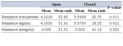The organizational resilience variable has three dimensions: robustness, agility, and integrity. Table 8 contains the average scores obtained in each dimension, separated according to the operational status of the business, as well as the average test results.