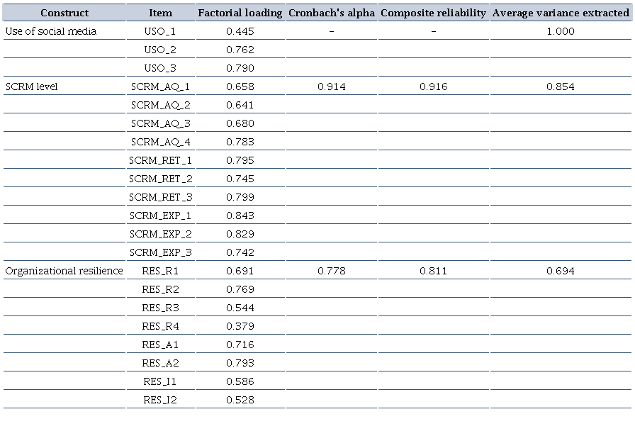 The theoretical model tested in this work has three latent variables: social media use (one dimension), SCRM level (three dimensions), and