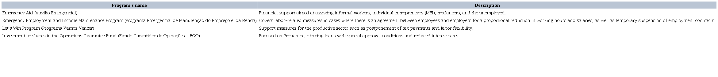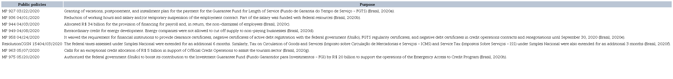 The Brazilian Government implemented several programs of support to the companies to mitigate the impacts of Covid-19 through provisional measures (medidas provisórias - MP) (Table 2).