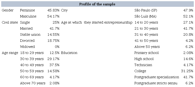 The questionnaire was finalized, inviting the entrepreneur to participate in the next phase of the research, giving an interview through teleconference. The interview allowed for collecting historical information and directing the questions (Creswell, 2014). The posterior analyses focused on the answers of the 48 entrepreneurs who gave the interview and had formal enterprises in São Paulo and São Luís.
