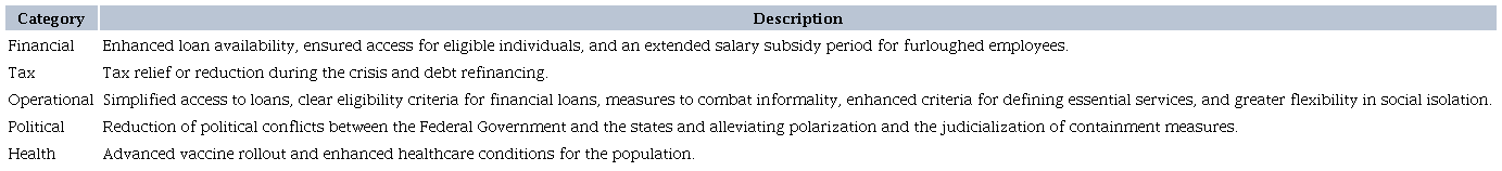 When questioned about what kind of measures or public policies could have been taken by the government to improve the performance of their businesses during the pandemic, the answers were diverse, focusing on five main aspects (Table 4).