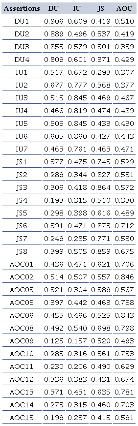 The evaluation of the measurement model consists of verifying the reliability (internal and composite) and validity (convergent and discriminating) of the constructs. Table 1 shows the discriminant validity for the cross-loading Matrix.