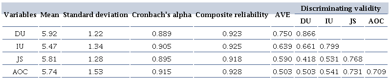 Two assertions (COA4 and COA7) were excluded from the model since they had factor loadings below 0.4 and impaired the quality of the measurement model. Table 1 shows satisfactory discriminant validity values for the cross-loading Matrix (cross-loading), as the factorial loads (in bold) are larger than the off-diagonal cross loads (Hair et al., 2017). These authors state that assertions above 0.4 and below 0.7 can be maintained in the model if there is no damage to the validity and reliability levels. Table 2 shows the values of the constructs’ mean, standard deviation, reliability, validity, and correlation.