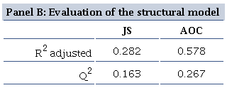 To evaluate the structural model, we used the effect size (f2), which determines how useful each variable is for model fit (Hair et al., 2017), and presented small and large effects here. The coefficient of determination (R2), which explains the combined impact of exogenous variables on the endogenous variable (Hair et al., 2017), shows that the model explains 28.2% of the variation in job satisfaction and 57.8% of the variation in affective organizational commitment. To evaluate the accuracy of the model, predictive relevance (Q2, also known as the indicator of Stone-Geisser, should present values above zero (Hair et al., 2017). All Q2 values were satisfying.