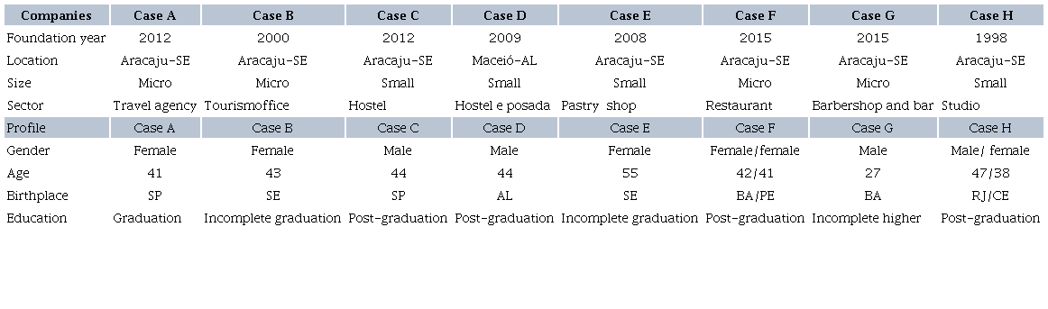 The research strategy adopted was a multiple case study (Yin, 2015) through empirical investigation in eight micro and small services enterprises. According to Eisenhardt (1989), choosing the cases randomly is not preferable; therefore, the cases were selected according to three criteria: 1. that the companies were micro or small companies due to the importance they have for the economic development of Brazil; 2. that they were from the service sector, due to the economic representativeness and jobs creation; and 3. that the entrepreneurs of these companies had implemented or were implementing innovation actions. Considering the selection criteria, Table 1 presents companies’ characteristics and entrepreneurs’ profiles.