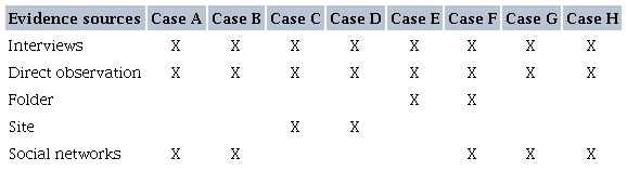 As for data collection, semi-structured interviews, documentary research, and direct observation were used, indicating the triangulation of evidence sources (Yin, 2015). In this sense, interviews with ten entrepreneurs of the eight selected enterprises searches in folders, websites, and social networks, and observation of the implemented innovations were the sources used to highlight the innovative actions of the entrepreneurs in the investigated cases. Table 3 presents a summary of the sources used in each case.