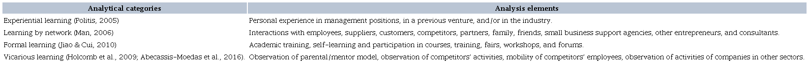 Thus, initially, the transcribed interviews were codified regarding the learning categories: experiential, by network, formal, and vicarious, based on the identification of the mentioned analysis elements. Soon after, associations were made between these categories and elements and the innovation actions identified in the messages of the interviewed entrepreneurs. Finally, the similarities and differences between the cases were observed by crossing the findings and disclosing them with the literature.