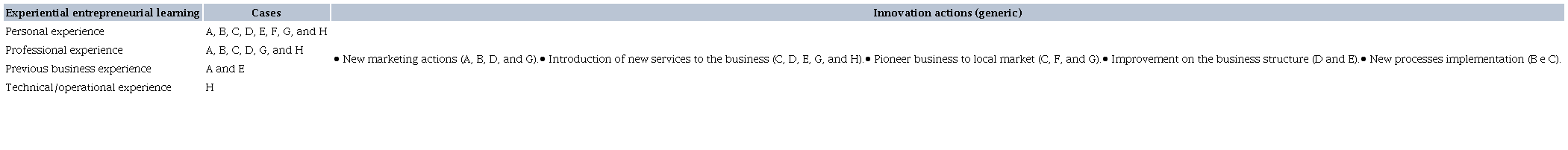 Experiential learning is highlighted as the most recurrent mode of entrepreneurial learning (Fust et al., 2017). In this sense, the evidence from the present study points to personal experience as the most consolidated and fundamental means (Lattacher & Wdowiak, 2020) for the accumulation of knowledge and subsequent adoption of important innovative actions in all cases analyzed (Politis, 2005; Lingen et al., 2020).
