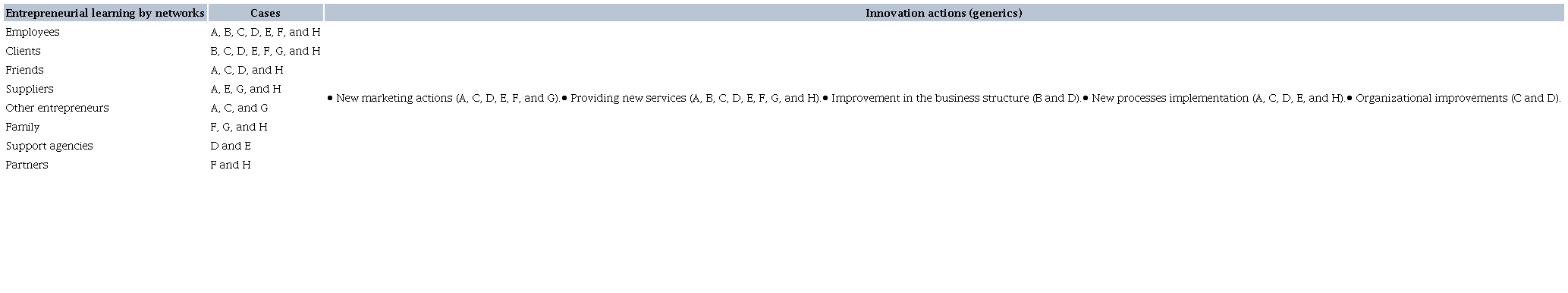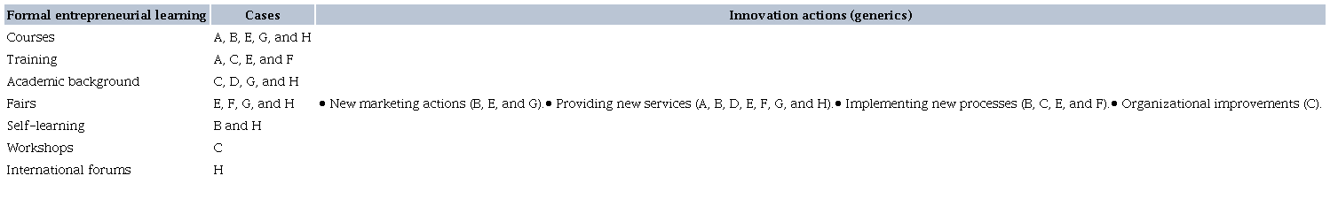 Finally, Table 8 presents a comparison of the findings regarding the mode of formal entrepreneurial learning and the innovative actions identified, emphasizing the adoption of innovations in services in most cases studied. This fact can be justified by the value creation for the various agents involved that innovation in services allows through new or improved offers and processes (Ostrom et al., 2010).