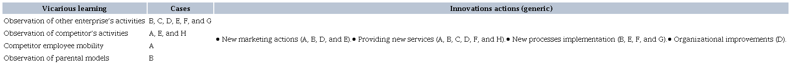 Regarding this analytical category, the findings indicate that vicarious learning - which concerns the internalization of perspectives and contents - resulted in innovative actions through indirect observations of the activities of competing companies (cases: A and H), indirect observations from partner companies (cases: C, D, and F) and observations of enterprises in other sectors (cases: B, C, D, E, F, and G) (Holcomb et al., 2009; Mansoori, 2017).