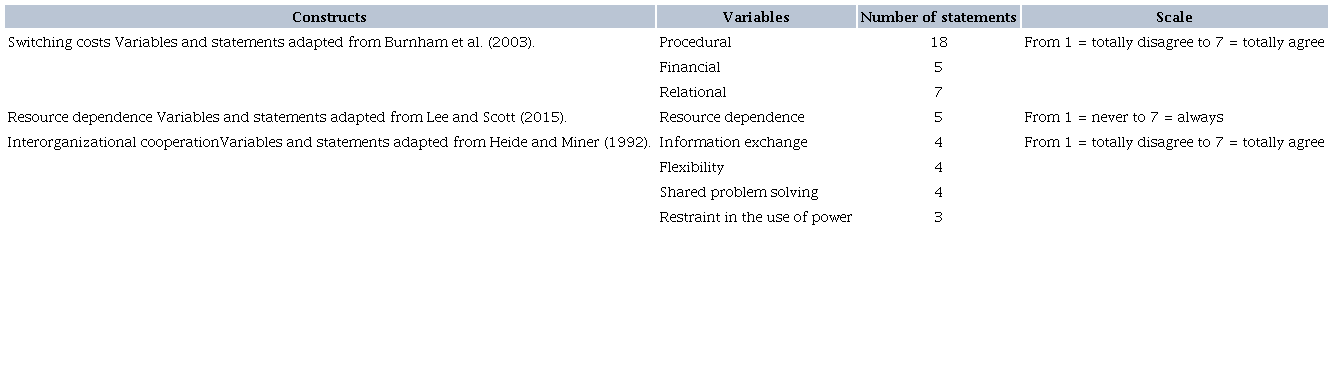 The EFA used during data analysis required the exclusion of four statements of the switching costs construct, three of the resource dependence construct, and three of the interorganizational cooperation construct. This suggests a limitation of the investigation since the exclusion of statements may compromise the proposed constructs’ nomological validity.