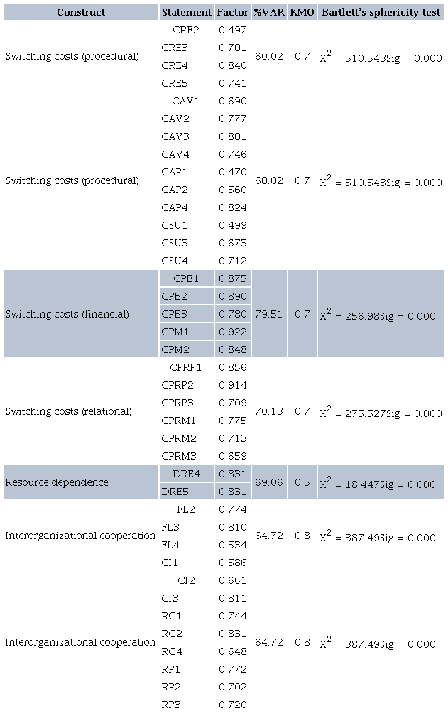 EFA procedures were performed using Varimax rotation and Kaiser normalization, as Fávero et al. (2009) recommended. The EFA demanded the exclusion of four statements of the switching costs construct (CRE1, CRE6, CAP3, and CSU2), three statements of the resource dependence construct (DRE1, DRE2, and DRE3), and three statements of the interorganizational cooperation construct (FL1, CI4, and RC3). After the exclusions, the indicators showed satisfactory adequacy indices.