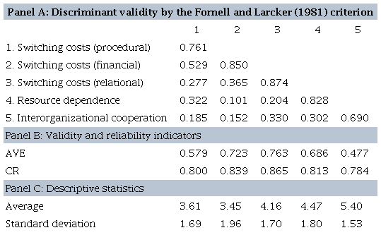 The composite reliability (CR) demonstrated the internal consistency of the measures by presenting values greater than 0.7 (Hair et al., 2017). The AVE confirmed the convergent validity by verifying how much the statements were positively correlated with the variables. The results for AVE of the switching costs and resource dependence constructs showed values greater than 0.5, indicating that the variables explain more than half of the variance of their indicators, as oriented by Hair et al. (2017).