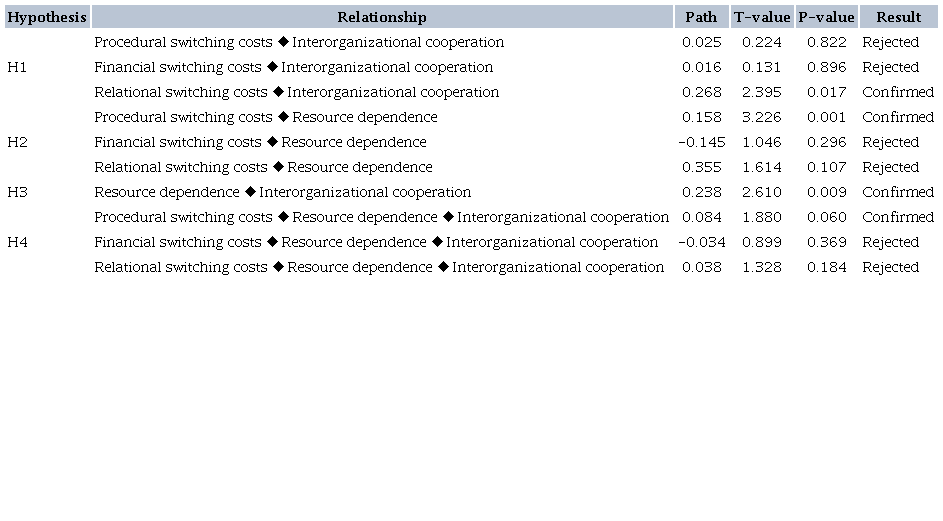 The structural model partially confirmed H1 through the relationship between relational switching costs and interorganizational cooperation. H2 was partially confirmed through the relationship between procedural switching costs and resource dependence. H3 was confirmed by the association between resource dependence and interorganizational cooperation, and H4 was partially confirmed by the relationship between procedural switching costs and interorganizational cooperation, mediated by resource dependence.